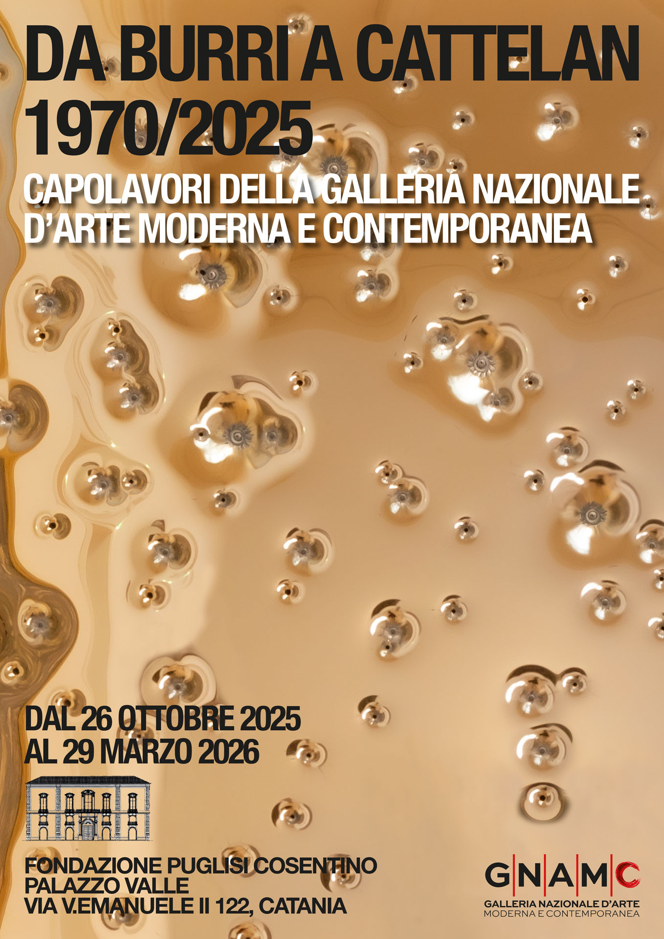 Per la prima volta giungerà in Sicilia un nucleo di circa 50 opere della Galleria Nazionale d'Arte Moderna e Contemporanea di Roma, diretta da Renata Cristina Mazzantini, per esemplificare il percorso dell'arte italiana dai primi anni settanta ad oggi, con l'aggiunta di alcuni capolavori di insigni artisti internazionali che hanno avuto stretti rapporti col nostro Paese. Ad accoglierli nelle magnifiche sale di Palazzo Valle, a Catania, sarà la Fondazione Puglisi Cosentino, che nella sua collezione già ospita in permanenza opere di grandi artisti come Carla Accardi, Alighiero Boetti, Piero Dorazio, Jannis Kounellis, Salvatore Scarpitta, solo per dirne alcuni. Con questa mostra, curata da Gabriele Simongini, la GNAMC rafforza quell'idea di "museo diffuso" portata avanti dalla direttrice Mazzantini e che prevede la diffusione in Italia e all'estero, mediante mostre e progetti mirati, di quella che è la raccolta più importante al mondo dedicata all'arte italiana dell'ottocento e del novecento. In questo caso, partendo dall'Informale di Alberto Burri, dal Realismo di Renato Guttuso e dalla Neometafisica di Giorgio de Chirico, saranno esemplificate quasi tutte le più significative correnti dell'arte italiana nella loro evoluzione in continuità con i linguaggi precedenti o nella loro nascita, dagli anni settanta ad oggi. Con un taglio al tempo stesso scientifico e divulgativo, la mostra avrà come primo obiettivo quello di avvicinare le scuole di ogni ordine e grado all'arte degli ultimi cinquant'anni, offrendo anche l'occasione di ripercorrere e riflettere sui cambiamenti della società italiana nel corso del tempo. Solo per citare alcuni nomi e correnti, oltre a Giorgio de Chirico, Alberto Burri e Renato Guttuso, sarà rappresentata l'evoluzione dell'astrattismo del gruppo "Forma 1" con Carla Accardi, Pietro Consagra e Piero Dorazio, varie modulazioni dell'arte concettuale con Enzo Mari, Eliseo Mattiacci e Giulio Paolini, la pittura oggettuale (Agostino Bonalumi), la Transavanguardia (Sandro Chia, Francesco Clemente, Enzo Cucchi, Nicola De Maria, Mimmo Paladino), la pittura colta di Carlo Maria Mariani, la Scuola di San Lorenzo (Bruno Ceccobelli, Gianni Dessì, Piero Pizzicannella, Marco Tirelli), oltre a grandi personalità difficilmente etichettabili come Maurizio Cattelan, Gino De Dominicis, Maria Lai, Ettore Spalletti, Rudolf Stingel. Fra gli artisti internazionali rappresentati spiccano i nomi di Hsiao Chin, Ahmet Güneştekin, Anish Kapoor, Joseph Kosuth, Sol LeWitt, Ugo Rondinone.